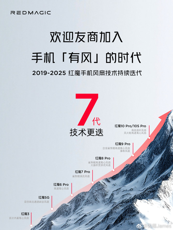 自 2018 年首款红魔手机诞生以来,散热与性能释放始终是品牌研发的核心方向。红魔 3 首创内置风扇的主动散热系统,开创了游戏手机 “风冷时代”;红魔 8 Pro 采用 3D 冰阶 VC 散热结构,进一步提升热传导效率;红魔 10 Pro 则率先引入复合液态金属散热方案,实现了导热材料层面的跨代提升。这七年间,红魔持续推动手机散热技术的革新 —— 从开创性的风冷到即将发布的水冷,这一系列技术演进既体现出红魔秉承 “追求游戏极致体验” 的理念、对手机散热展开的极限探索,也奠定了其在移动电竞领域的技术领先地位。而每一次迭代,都是对极限性能释放的重新定义。