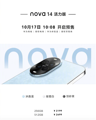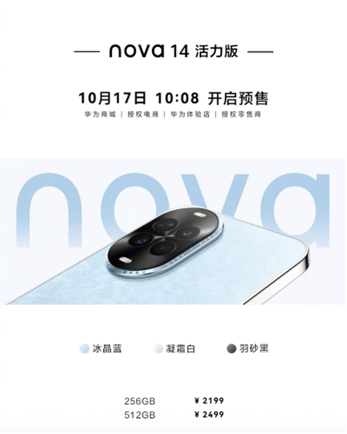 10月17日,华为nova 14 活力版正式亮相,并在华为商城及授权电商平台同步开启预售,10月24日正式开售,售价2199元起。这款定位年轻用户群体的5G手机,以其全面升级的影像能力、智慧化的鸿蒙AI体验、轻薄可靠的机身设计以及强劲的通信续航性能,迅速成为2000元档位的明星产品。