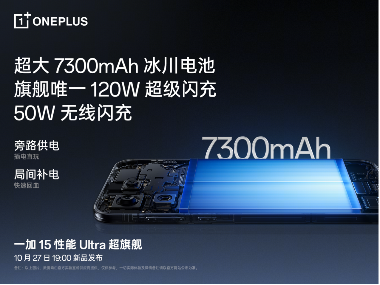 一加 15 搭载 7300mAh 超大容量「冰川电池」。作为专为高性能手机打造的电池,一加 15 搭载的「冰川电池」采用 X25 双电芯架构,硅含量高达 15%,能量密度高达 814Wh/L。配合 120W 超级闪充+50W 无线闪充,一加 15 拥有旗舰档位中领先的豪华续航配置与充电组合。此外,一加 15 还带来「局间补电」、「旁路供电」等针对游戏场景的专属优化,能为长时间重度游戏提供强大的续航保障。