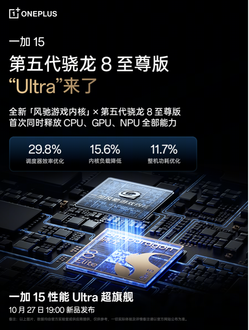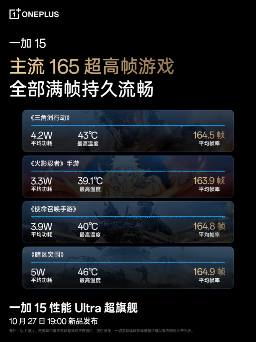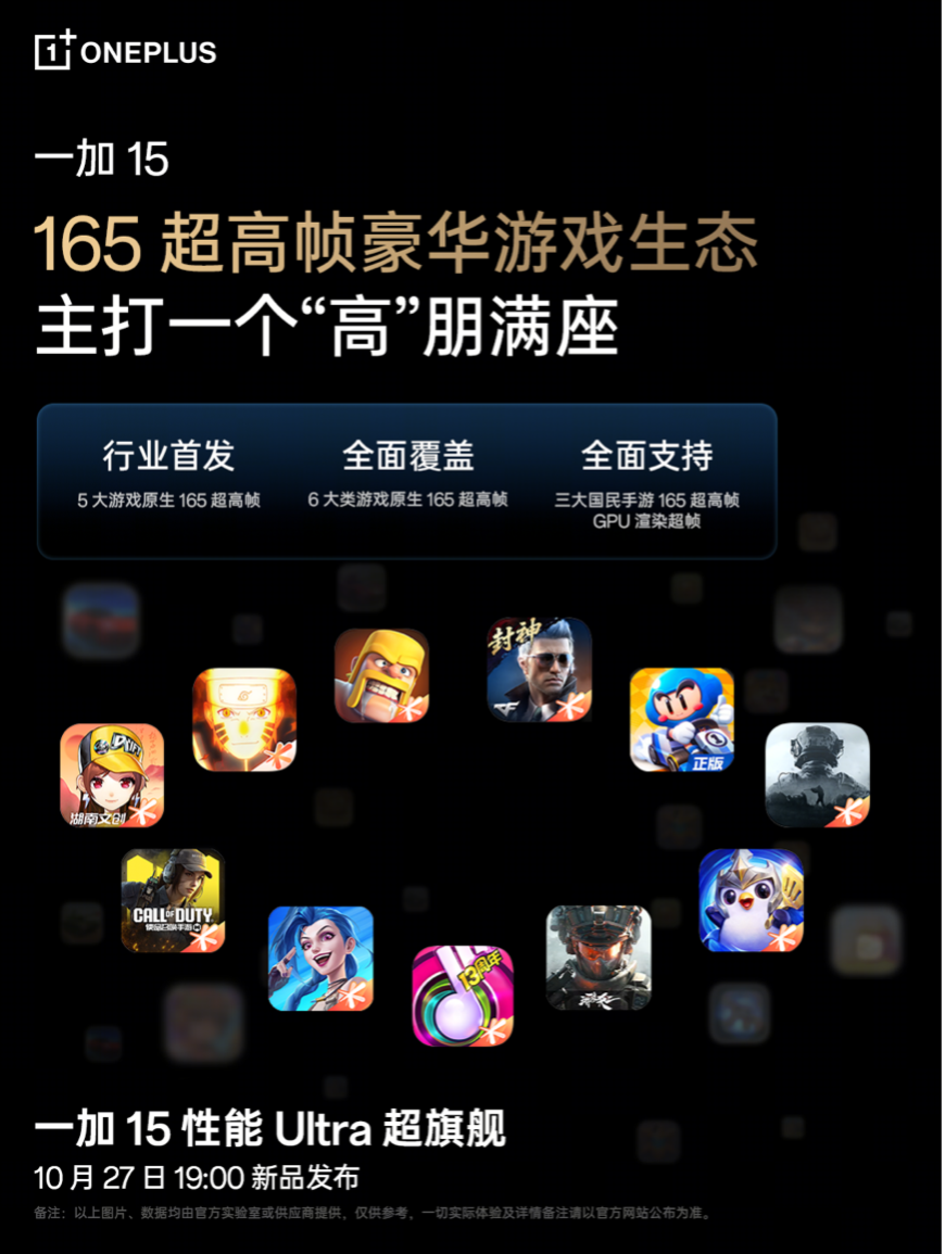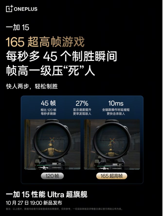 10 月 20 日,一加手机宣布「性能 Ultra」一加 15 搭载第五代骁龙 8 至尊版移动平台,配合全新一代「风驰游戏内核」,将带来行业最强的 1 % Low 帧表现。此外,一加 15 率先实现主流游戏 165 帧无限满帧,能为用户带来持久高帧的游戏体验,是名副其实的「枪神首选」。