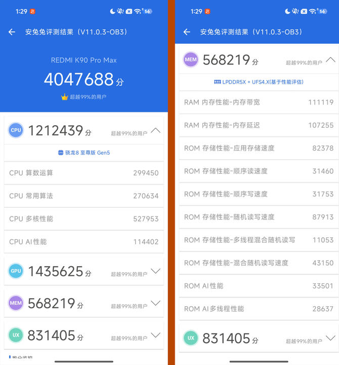 REDMI K90 Pro Max配置毫无疑问是是目前移动端最强平台,高通第五代骁龙8至尊版移动平台,配合上LPDDR5X+UFS 4.1的黄金组合,安兔兔跑分来到了404W,性能表现非常出色。