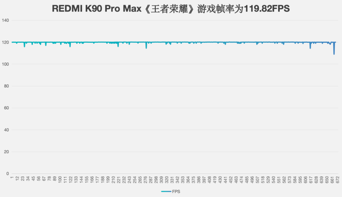 经过我们的实际测试,可以看到,REDMI K90 Pro Max一局15分钟的游戏下来,游戏帧数平均在119.82FPS,游戏帧数非常稳定,整个游戏过程的平均功耗为3.25W,核心最高温度仅为34.6摄氏度,性能释放非常出色。