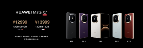 目前,华为Mate X7已开启预订,新机将于12月5日正式开售,起售价12999元。