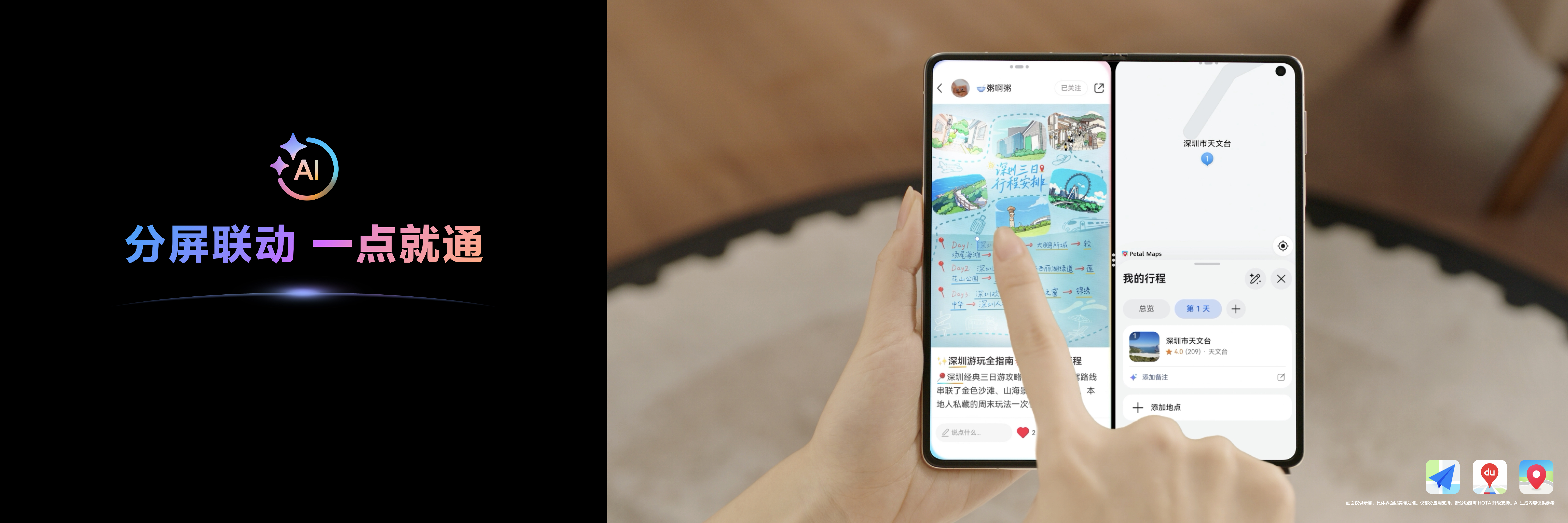 出差途中,分屏导航功能让规划与指引同步呈现。长按行程地址开启分屏导航,小艺能分析单个或者多个地点,在另一侧的分屏地图上规划最优路线,确保你在行程高效通行。