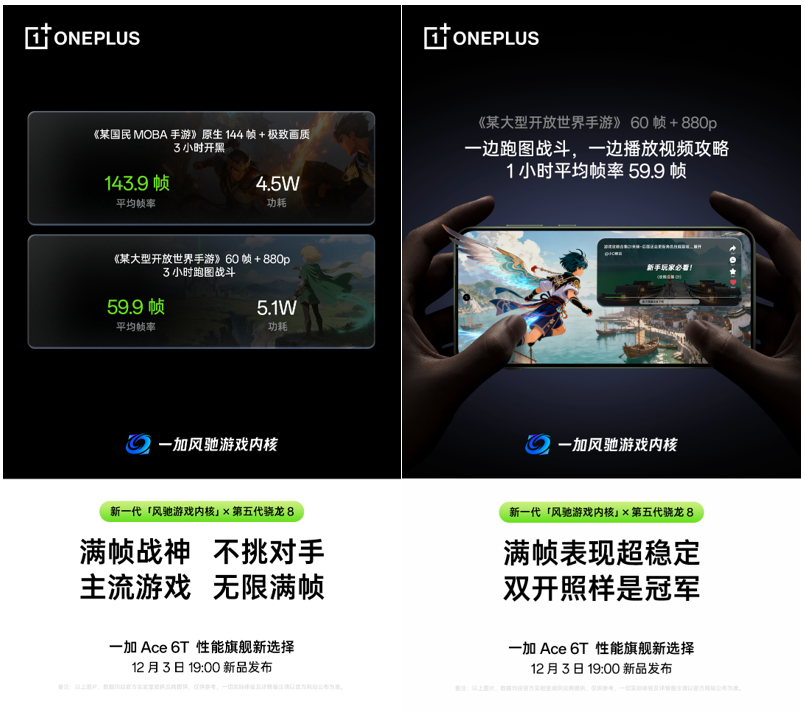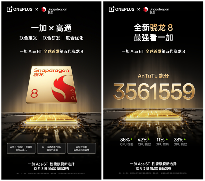 2025 年 11 月 27 日,一加中国区总裁李杰(@李杰 Louis)发文表示,年度性能旗舰一加Ace 6T 将于 12 月 3 日(下周三)晚 7 点正式发布。这款被定义为 “性能旗舰新选择” 的机型,不仅实现了一加史上首次骁龙8 系旗舰芯片的全球首发,更凭借与高通两年联合研发的深度合作,以及多项独家技术加持,剑指 “满帧电竞” 体验天花板。