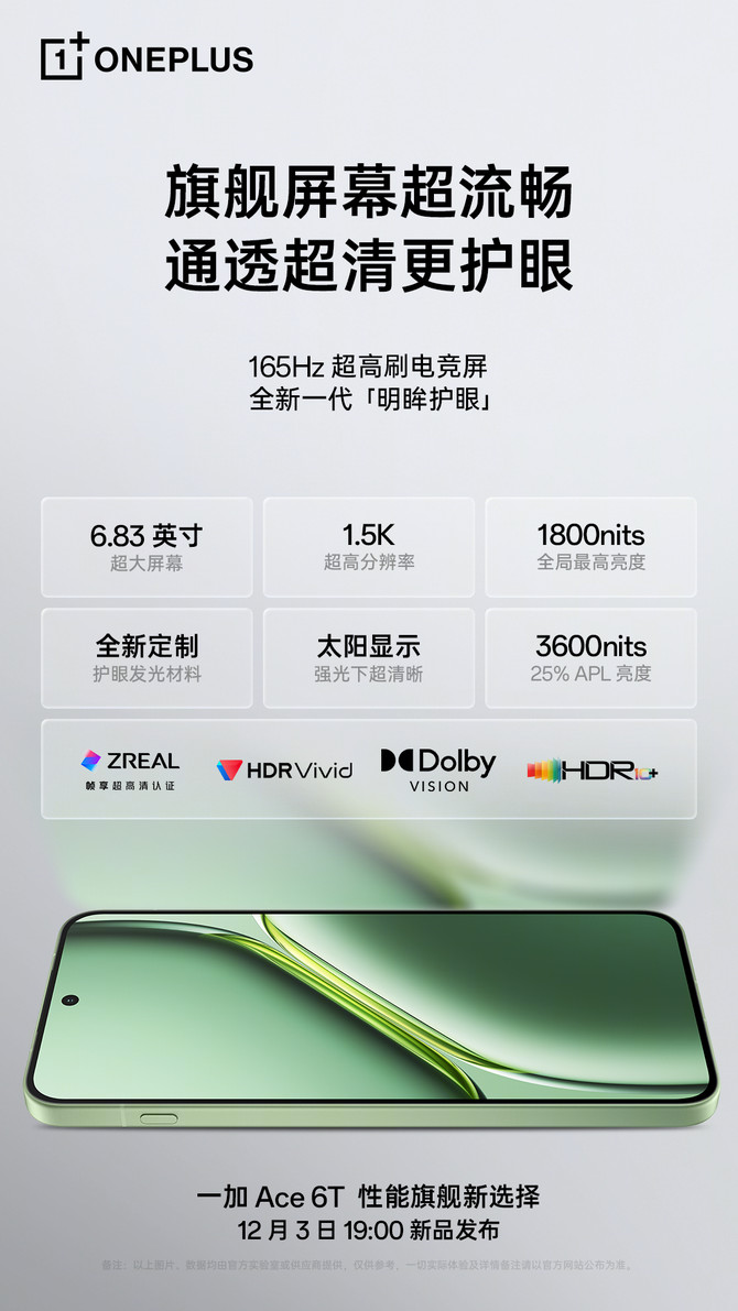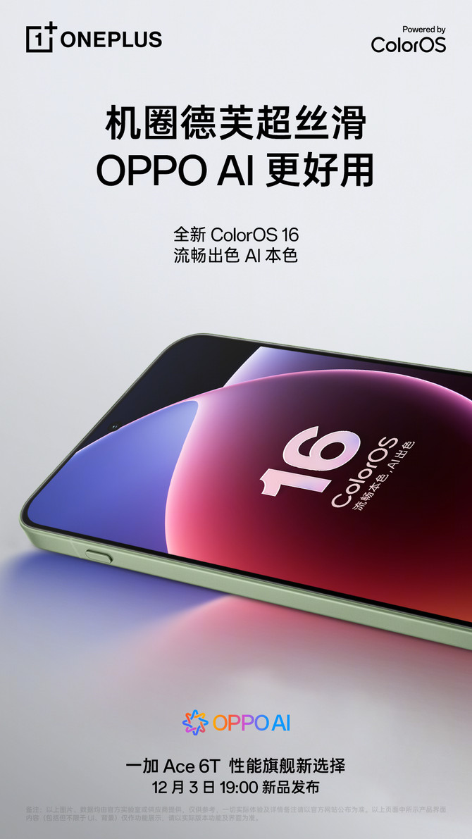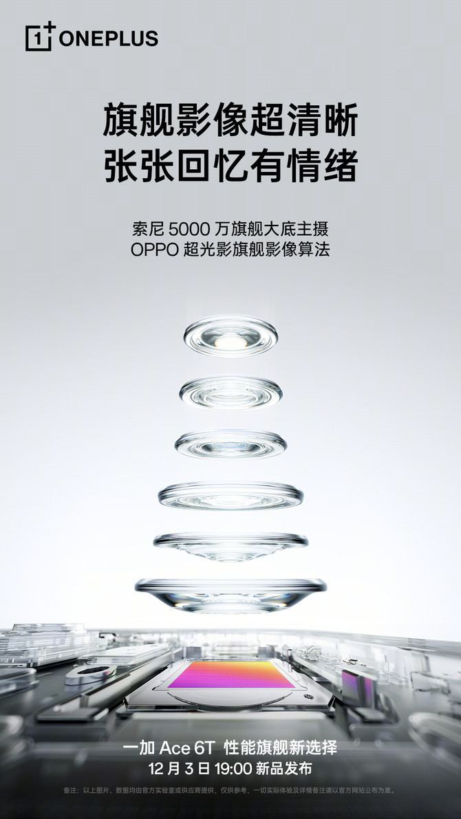 12月1日,一加手机官方继续预热一加Ace 6T新机,公布多项核心配置“一加Ace 6T配备5000万索尼超光影大底主摄,内置OPPO超光影旗舰影像算法。搭载165Hz超高刷电竞屏,系统搭载“机圈德芙”ColorOS 16