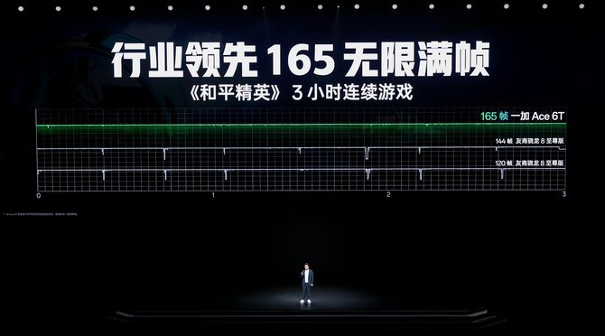 一加Ace 6T将独 家自研的全新一代「风驰游戏内核」写入第五代骁龙8芯片底层,充分释放这颗芯片全部性能,大幅提升游戏表现。在风驰游戏内核的加持下,一加Ace 6T可以轻松驾驭165超高帧游戏,实现同档唯一 165 无限满帧游戏体验。相比主流手机的120帧,一加Ace 6T的165 超高帧游戏每秒画面显示数量多45帧,画面显示速度提升27%,全链路操作时延缩短10ms,每秒操控速度提升17%,操作响应快人一步,不仅提高了游戏的流畅性,也提高了游戏的胜率。实测显示,一加 Ace 6T连续运行《和平精英》3小时,帧率持久流畅,帧率稳定性优于同等环境下友商骁龙8至尊版机型的120帧或144帧游戏表现,且在1% Low帧表现上也做到引领。
