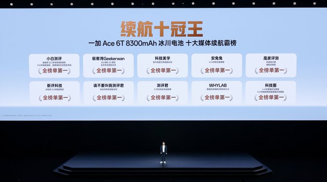一加 Ace 6T配备8300mAh 超巨量冰川电池,支持100W超级闪充,是行 业中唯 一兼具8300mAh 电池和百瓦闪充的机型,续航实力异常强悍,霸榜10大专业科技媒体续航实测榜单榜首,成为当之无愧的“续航十冠王”。