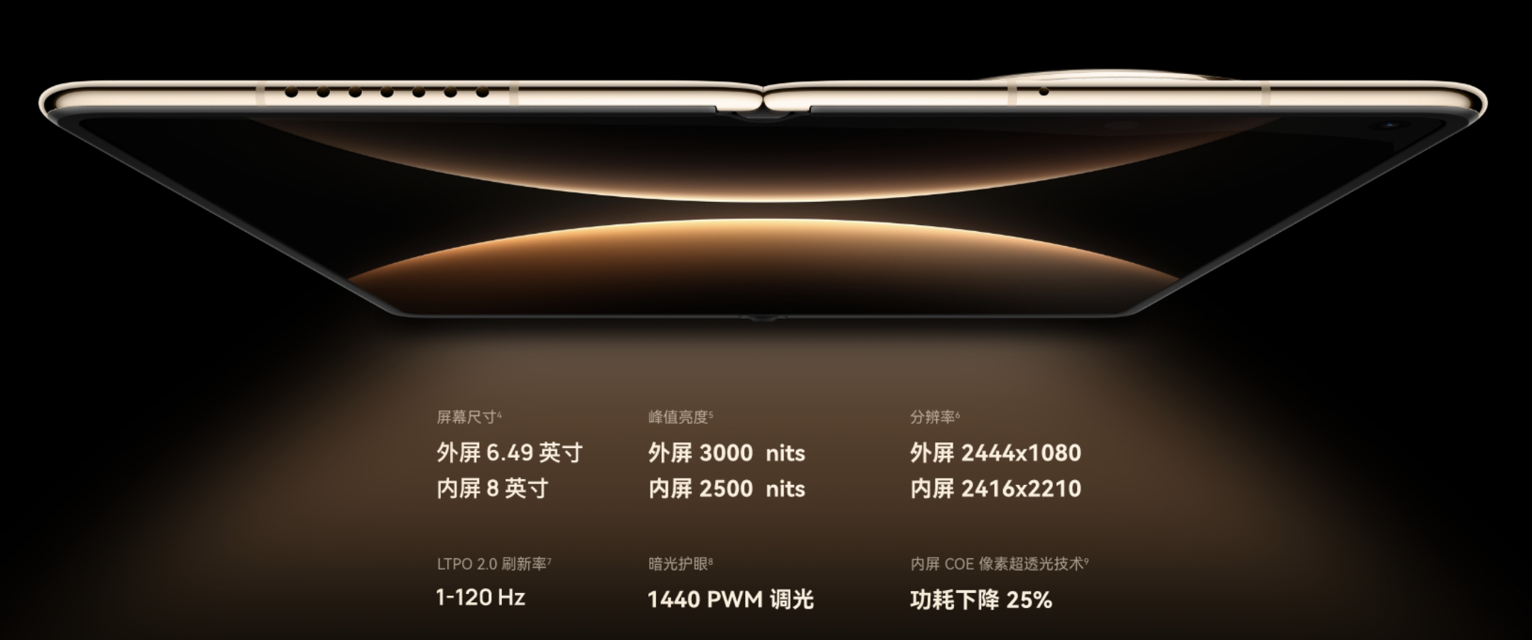 屏幕表现上,Mate X7 配备 6.49 英寸 OLED 外屏与 8 英寸 OLED 内屏的双屏组合,外屏分辨率达 2444×1080,峰值亮度 3000nits;内屏分辨率 2416×2210,峰值亮度 2500nits,双屏均支持 1-120Hz LTPO 自适应刷新率与 1440Hz 高频 PWM 调光技术,既能保证流畅操作体验,又能有效降低眼部疲劳,412ppi 的屏幕像素密度则带来清晰细腻的视觉效果。