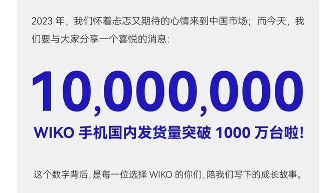 WIKO自2023年正式进入中国市场以来,凭借与鸿蒙生态的深度绑定,快速夯实市场根基并站稳脚跟,仅用两年左右时间就成功跻身中国全价位段智能手机品牌第七名。近一年间,品牌更实现了国内智能手机市场中罕见的高速增长态势,通过精准把握消费需求、密集推出全新产品矩阵,进一步加速了市场突围,推动品牌在11月初达成国内市场出货量破1000万台的关键里程碑。