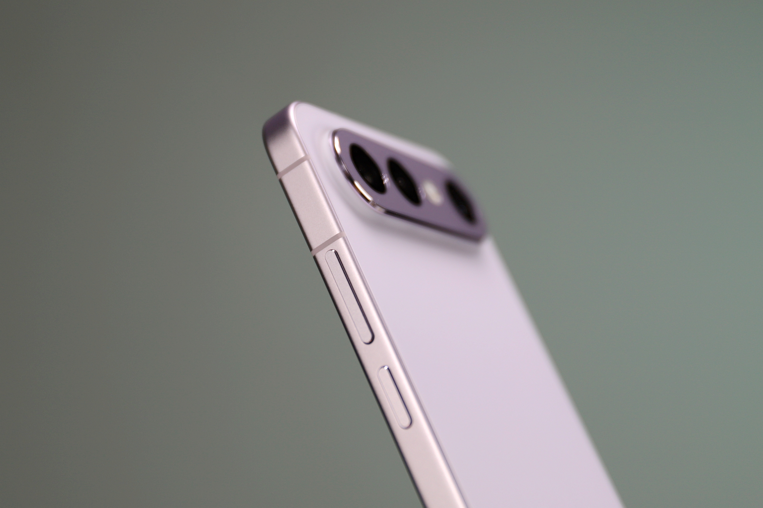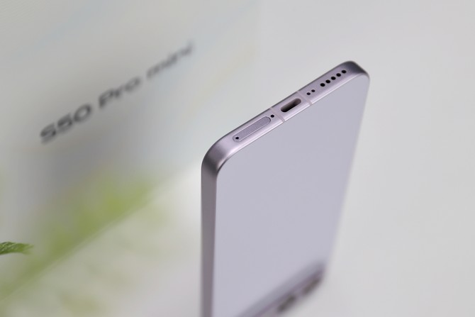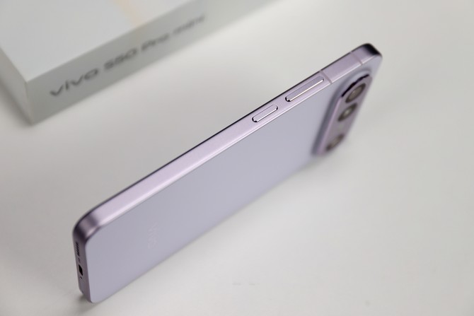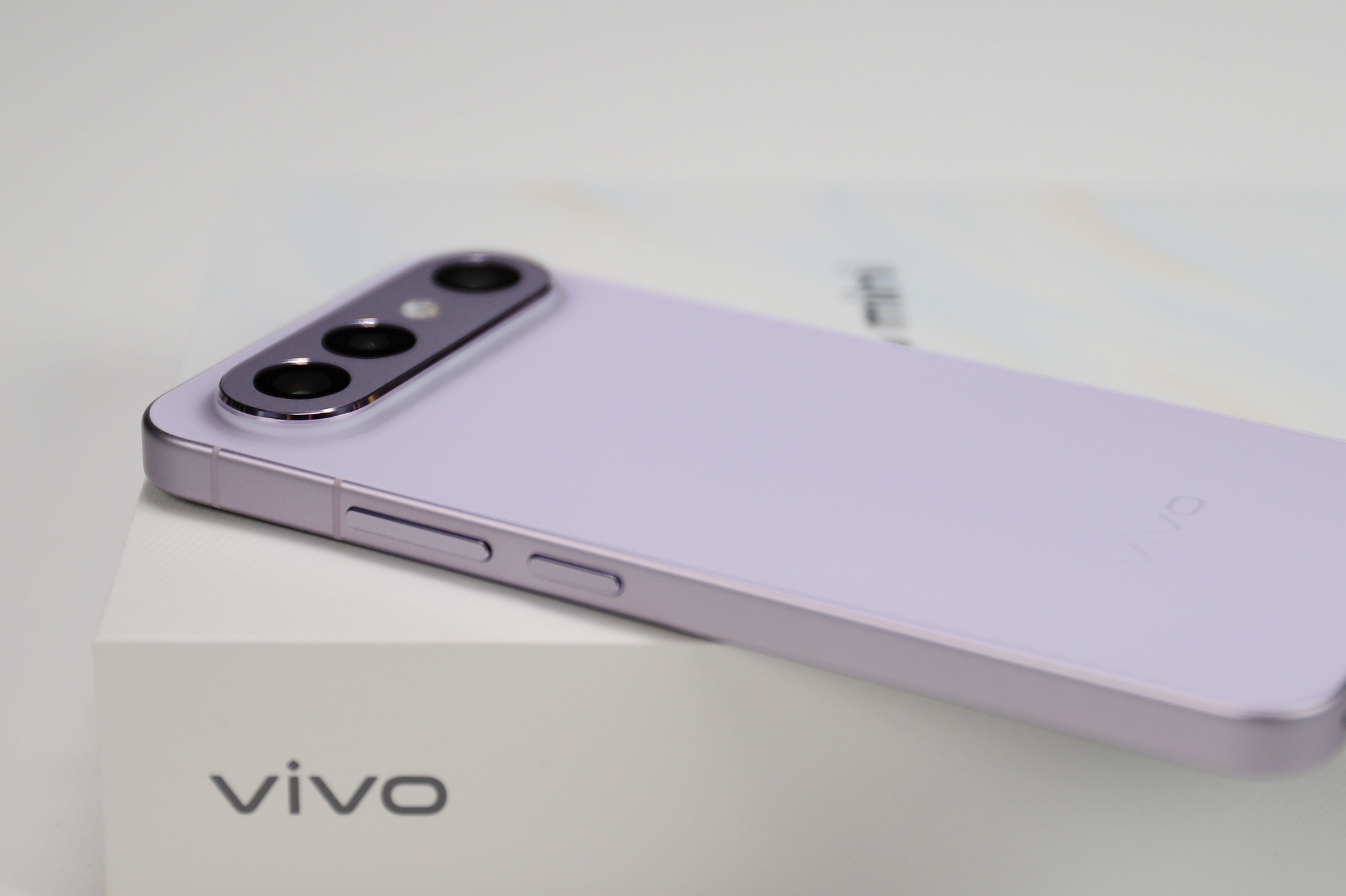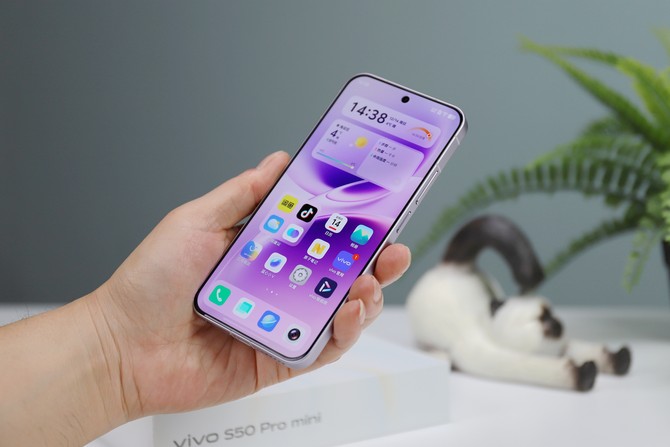 机身背部的工艺更是点睛之笔。vivo S50 Pro mini 采用了缎面柔光玻璃材质,配合纱缎光刻工艺,在微米级的纹理层上布满千万个点阵光栅。轻转手机时,能看到紫色光影如纱缎般流动,细腻又灵动,相比传统 AG 玻璃,不仅视觉上更显高级,触感也丝滑温润,还能有效抵御指纹,冬天抹完护手霜握持也依旧清爽。航空级铝金属中框经过细腻喷砂处理,与背部玻璃自然过渡,侧边的圆润 R 角设计贴合手掌曲线,长时间握持也不会有硌手之感。