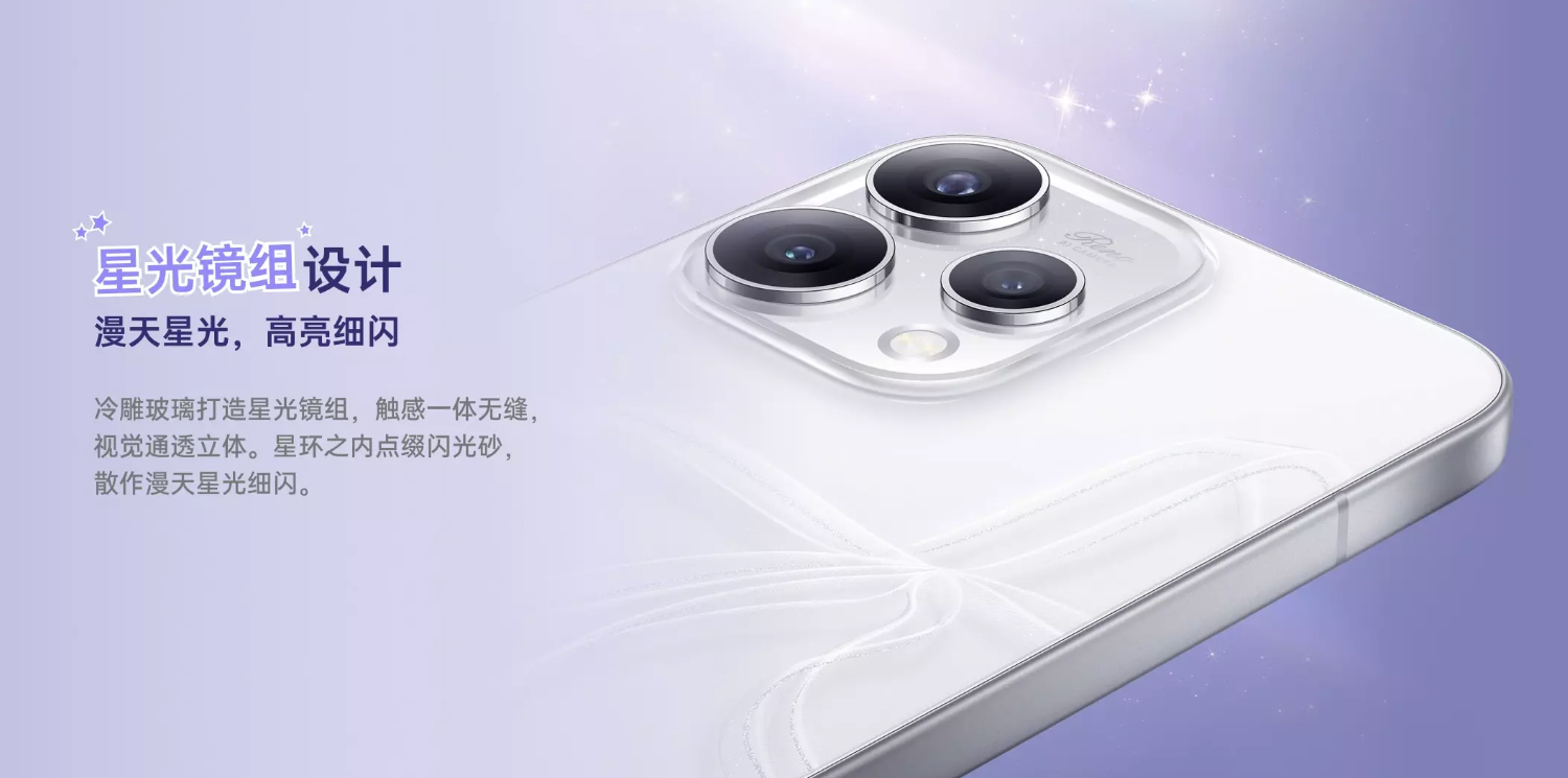 机身形态上,产品追求极致轻薄,星光蝴蝶结与学院蓝版本的厚度仅为 7.77mm,极光蓝版本为 7.89mm,整机重量约 197g,搭配圆润流畅的机身线条,握持手感轻盈舒适,长时间使用无负担。此外,星光镜头组采用冷雕玻璃打造,与机身融为一体无缝设计,而且星环内还有闪光砂点缀,犹如漫天的星光在细闪。