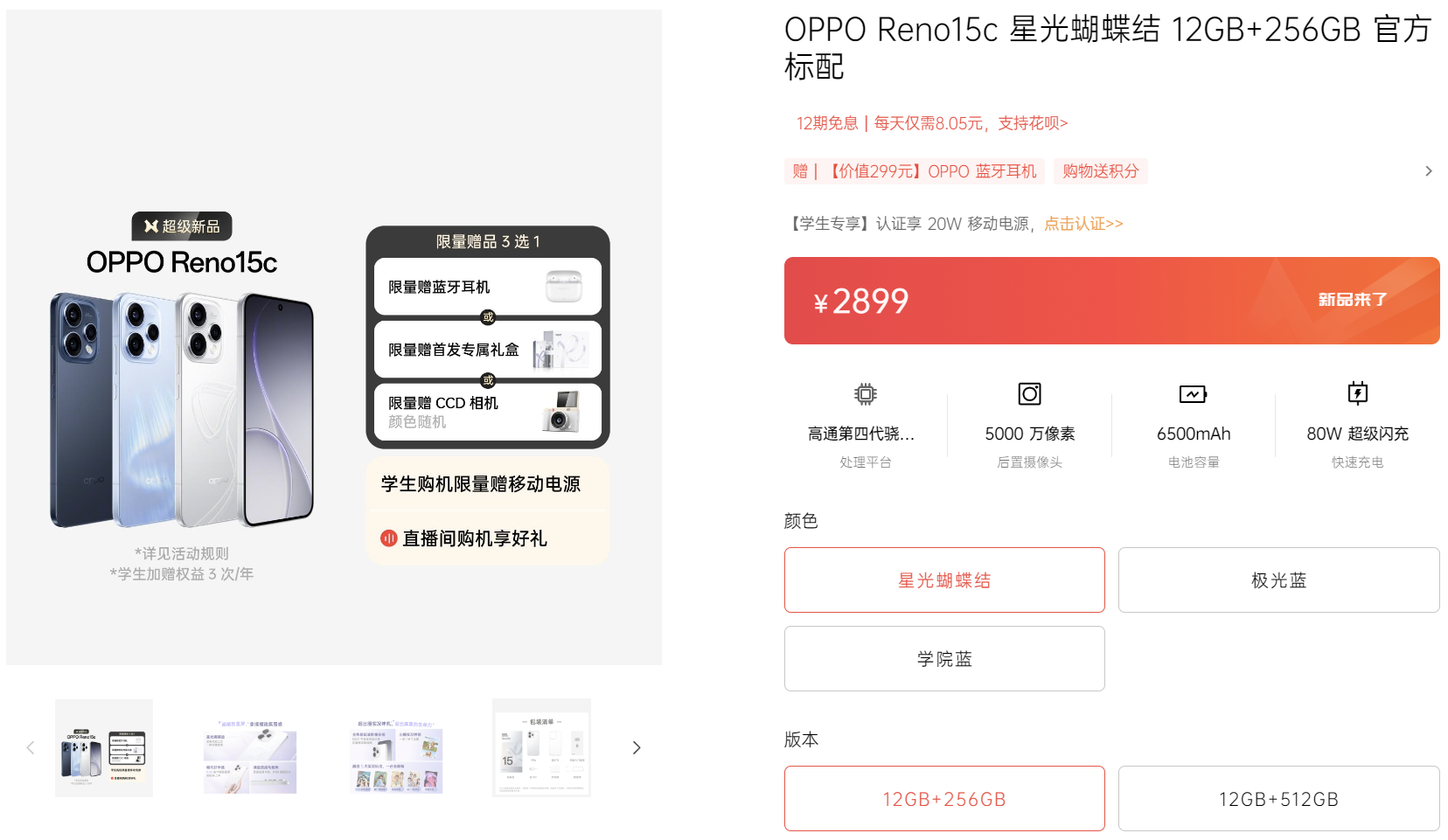 2025 年 12 月 19 日,OPPO Reno15c 新品悄然登陆官方商城开售,以 "星光蝴蝶结" 为代表的潮流配色搭配高通第四代骁龙7 移动平台、6500mAh 超大电池与全焦段影像系统,为年轻用户带来性能与颜值兼备的旗舰体验。目前 12GB+256GB 版本预售价 2899 元,支持 12 期免息,购机即享多重限量好礼,学生用户更有专属权益加码。