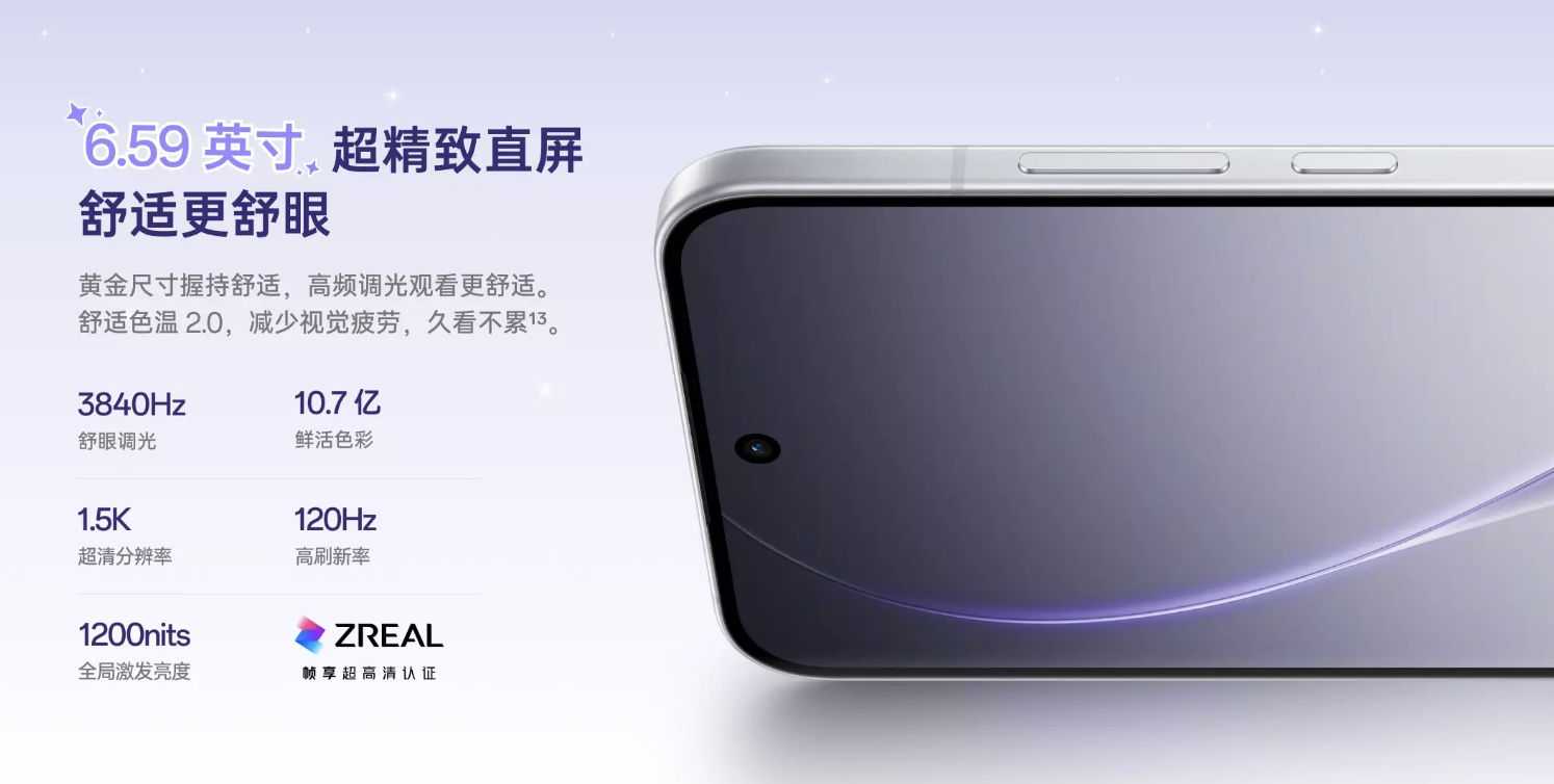 正面配备 6.59 英寸 AMOLED 柔性直面屏,1.5K超清分辨率,120Hz高刷新率,以及1200nits全局激发亮度。此外,具有的高频调光、舒适色温2.0,可以减少长时间观看屏幕时的视觉疲劳。