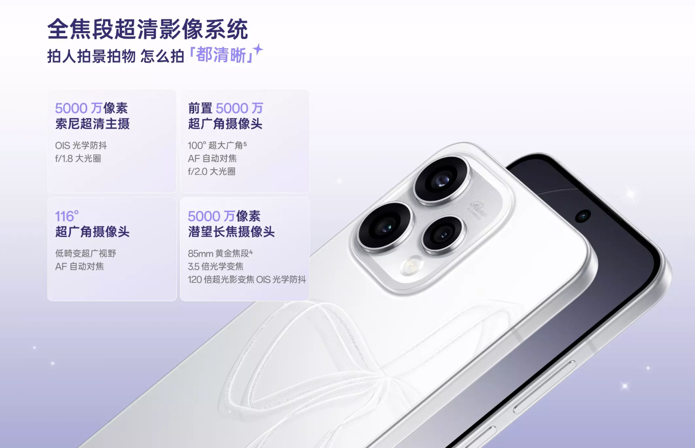 作为本次新品的核心亮点,OPPO Reno15c 在影像配置上实现全面升级。后置搭载 5000 万像素广角主摄 + 800 万像素超广角镜头 + 5000 万像素长焦镜头的全焦段三摄组合,其中广角与长焦主摄均支持两轴 OIS 光学防抖,最高可实现 3.5 倍光学变焦与 120 倍数码变焦。前置 5000 万像素 AF 自动对焦摄像头,搭配美颜自拍、屏幕补光等功能,轻松拍出自然通透的自拍大片,AI 证件照、萌拍等实用模式进一步丰富创作场景。视频拍摄方面,前后置均支持 4K 60fps 防抖录制、HDR 视频及电影模式,慢动作拍摄最高可达 240fps,满足用户多样化视频创作需求。