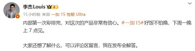 10月23日,一加中国区总裁李杰通过社交媒体发布重磅消息,一加15新品发布会首次彩排已顺利完成,同时他明确表态“内部对这次的产品非常有信心”,并用“好饭不怕晚”形容这款新旗舰的精心打磨历程。据悉,这款备受行业与消费者期待的一加新一代旗舰机型,将于10月27日晚7点正式亮相。