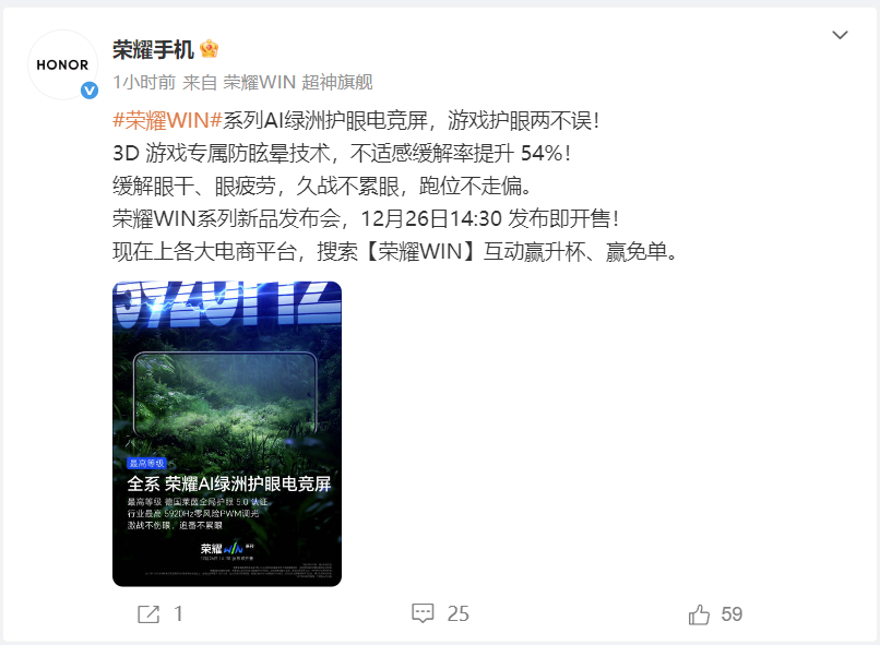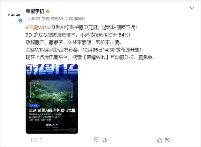 距离12月26日14:30荣耀WIN系列新品发布会仅剩两天,官方持续爆料,继行业首发「荣耀东风涡轮散热」技术后,12月24日荣耀手机官微再次官宣,该系列将搭载AI绿洲护眼电竞屏,实现游戏体验与眼部保护的双重兼顾,为“年度电竞夯机”的定位再添有力佐证。