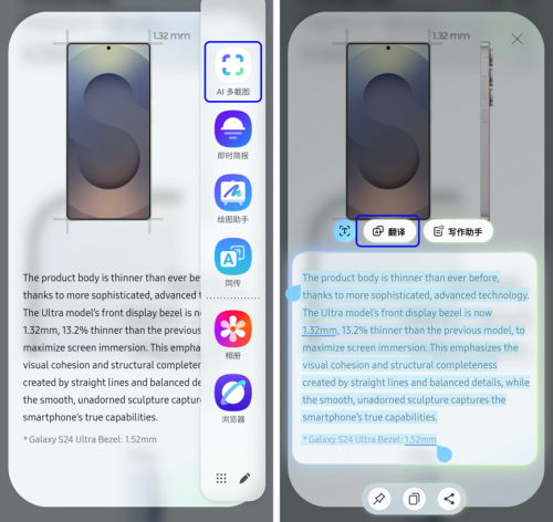 来到会议现场,在临时收到的会议资料当中发现不熟悉的外文内容。使用“AI多截图”功能,圈选需要翻译的文字,系统便会根据内容特征预判用户的下一步操作,给出翻译、写作助手等选项,直接点击即可显示中文内容,不用跳转,也无需复制粘贴,一切都那么自然。