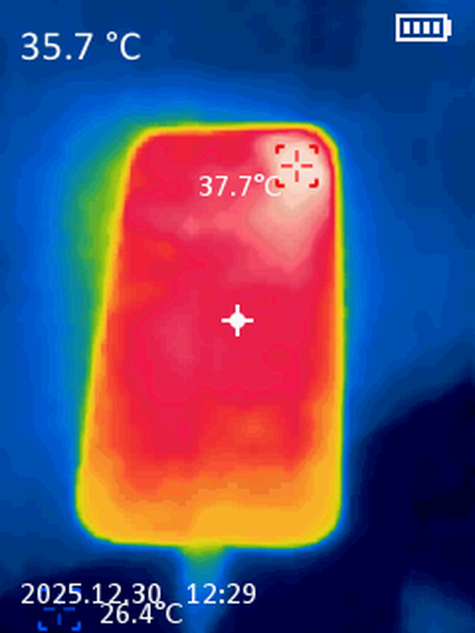 20分钟测试后,环境温度 23℃,机身最高温度约37.8℃,属于非常可控的区间。