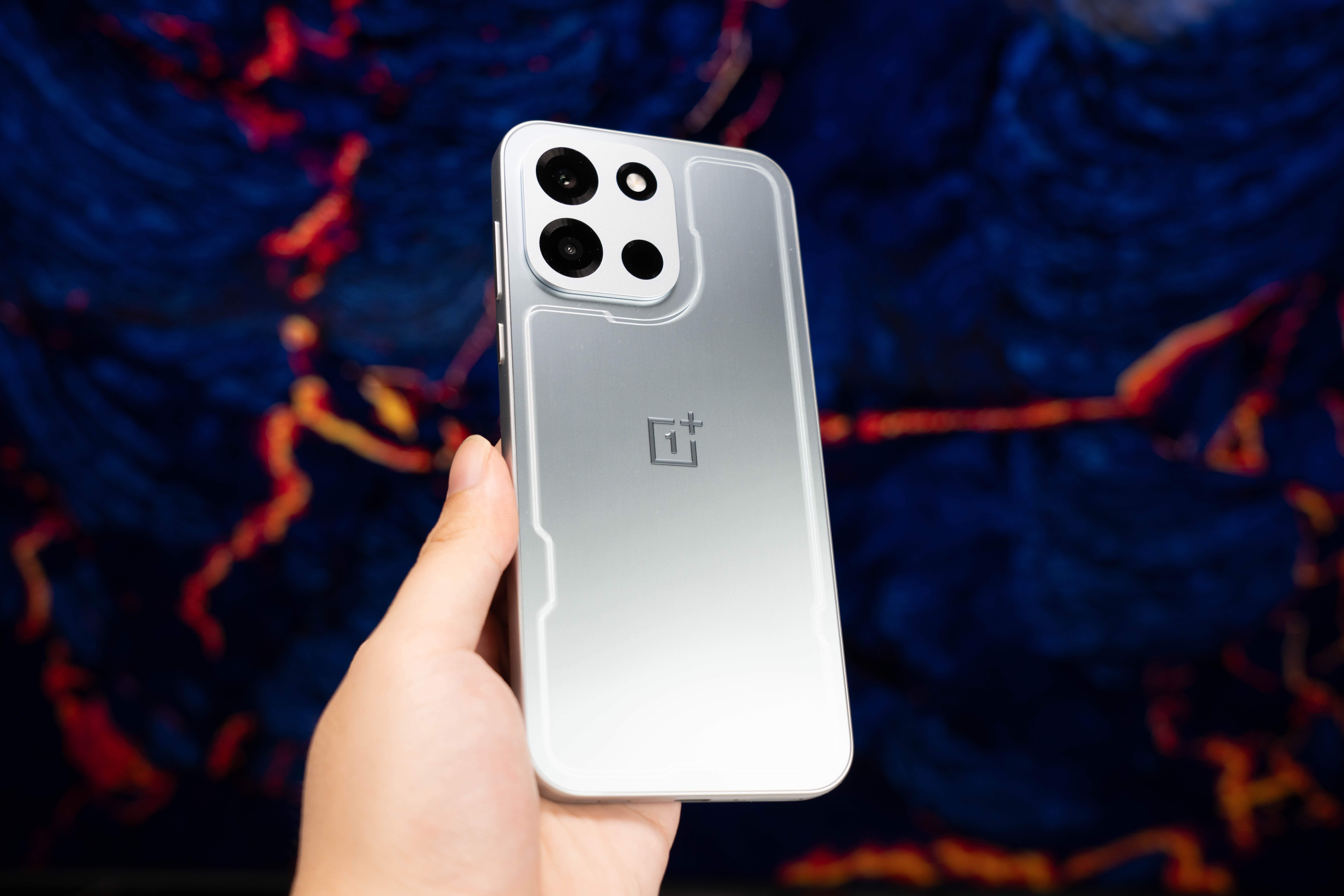 15.5mm 的大 R 角让整机线条非常顺滑,搭配金属后盖,视觉上并不强调性能标签,而是偏向干净、收敛的设计语言。追光银配色采用 3D 全息雕刻工艺,在不同角度下会呈现出细微的光影变化,同时对指纹和油污的控制也比较到位,更偏向长期使用取向。