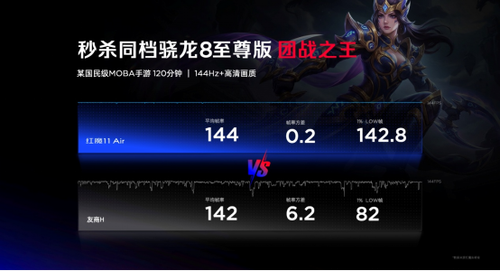 在144Hz高清画质下运行120分钟某国民级MOBA手游。红魔11 Air平均帧率为144帧,1%LOW帧为142.8帧,对比机型平均帧率为142帧,1%LOW帧为82帧。