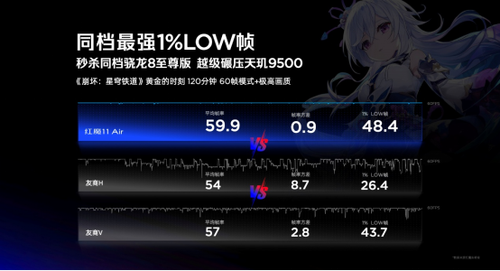 在60Hz极高画质下进行120分钟《崩坏:星穹铁道》黄金的时刻测试。红魔11 Air平均帧率为59.9帧,1%LOW帧为48.4帧;对比机型H平均帧率为54帧,1%LOW帧为26.4帧;对比机型V平均帧率为57帧,1%LOW帧为43.7帧。
