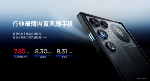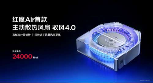红魔11 Air这一次直接在Air机型上,首次搭载了主动散热风扇——驭风4.0,可实现每分钟24000转持续转速。