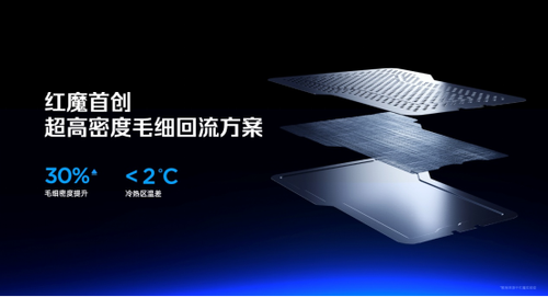VC均热板内部也有创新,红魔首创了超高密度毛细回流方案,毛细密度提升了30%,冷却液回流速度大幅提升。据红魔官方宣称,超厚冰阶VC能够实现小于2°C的冷热区温差,为手机带来强劲均热、散热能力。