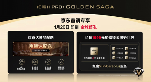红魔11 PRO+ 臻金传奇在京东首销期间,还可专享:京尊达奢品配送、价值1999元的VIP-Careplus服务、5折保值换新,以及长达四年的电池保等全方位保障。