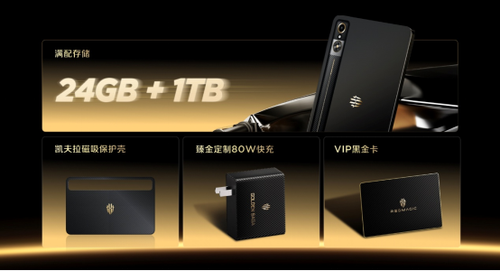 红魔 11 Pro+ 臻金传奇搭载行业独有的24GB+1TB的顶配存储组合,内部配备凯夫拉磁吸保护壳、专属磁吸散热器与臻金卡针、120W魔闪快充等一整套臻金体验,售价为:9899元;