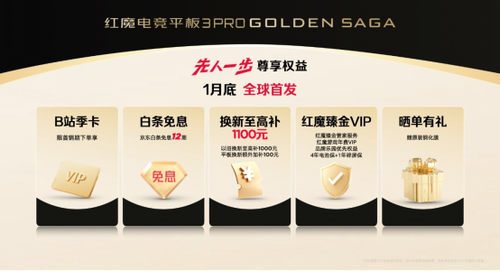 而红魔电竞平板3 Pro 臻金传奇同样搭载24GB+1TB的顶配存储组合,配备红魔 11 Pro+ 臻金传奇同款臻金装备,预计1月底全球首发,上京东先人一步首销尊享B站季卡、12期白条免息、以旧换新至高补贴1100元,红魔臻金VIP、晒单有礼等权益。