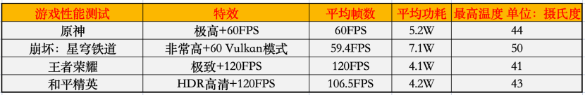 可以看到,在主流的游戏中测试时间约为30分钟,游戏的平均帧数表现优秀,并且功耗释放也非常OK,对于玩家来讲的话,这样的性能表现着实出色,不得不说在GPU的性能表现上,天玑确实非常给力,更适合游戏玩家选择。