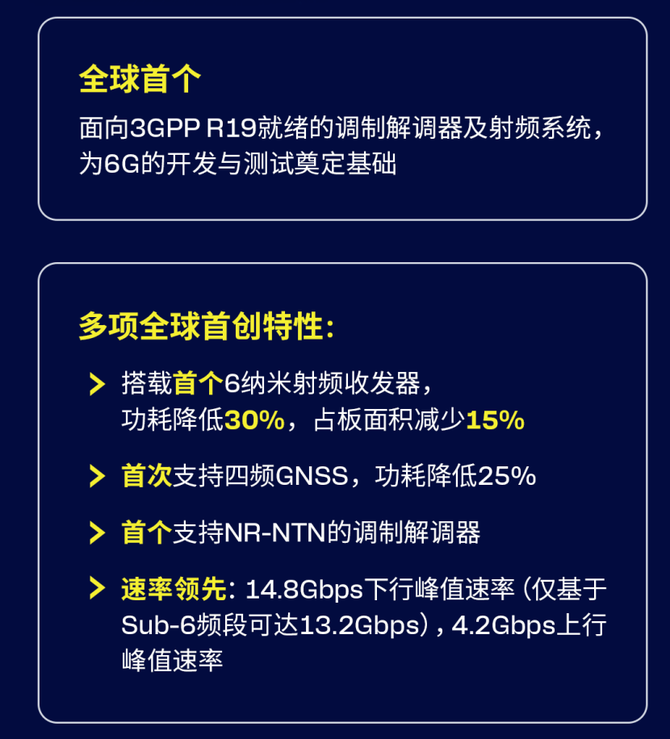 为了实现从5G到6G的平滑过渡,高通还推出了全球首款面向3GPP Release 19就绪的X105 5G调制解调器及射频系统,成为5G-A领域的标杆产品。该产品实现了14.8Gbps下行峰值数据速率和4.2Gbps上行峰值数据速率,引入6纳米射频收发器、四频GNSS等全球首创特性,功耗较前代降低30%,占板面积减少15%。