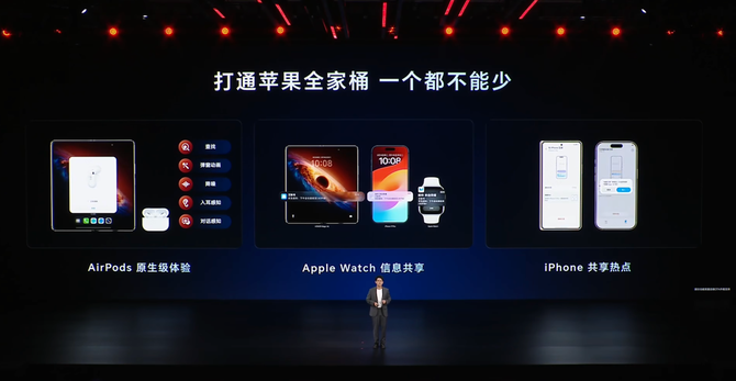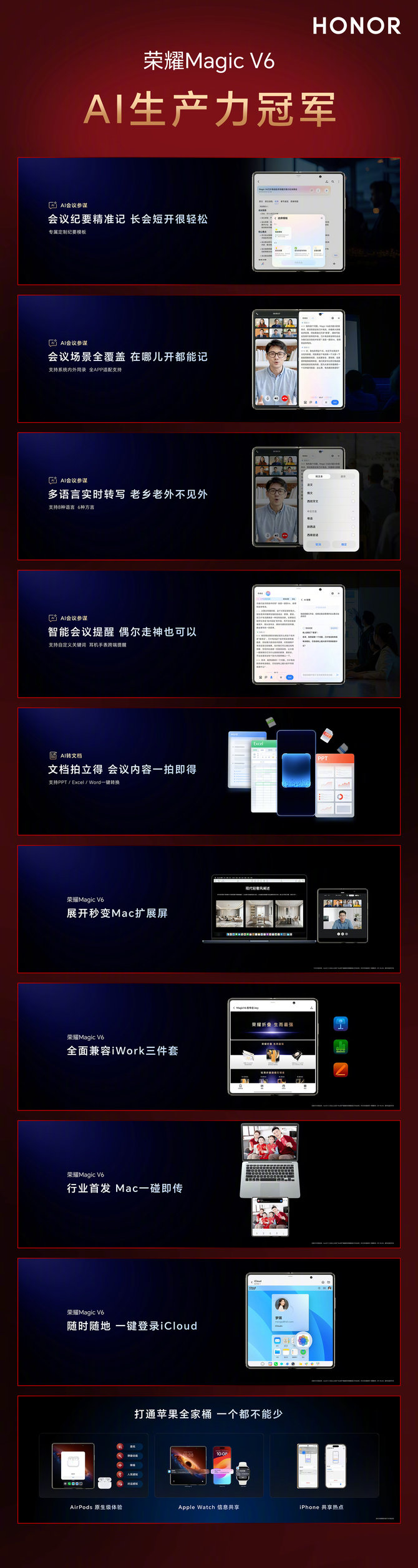 值得一提的是,荣耀Magic V6 还深度兼容苹果生态,不仅可以查看 iCloud 云图库、作为 Mac 拓展屏使用、兼容 iWork 三件套,还行业首发 Mac 一碰即传功能,同时支持 AirPods 原生级体验、Apple Watch 信息共享与 iPhone 共享热点,彻底打破了不同设备生态之间的壁垒。