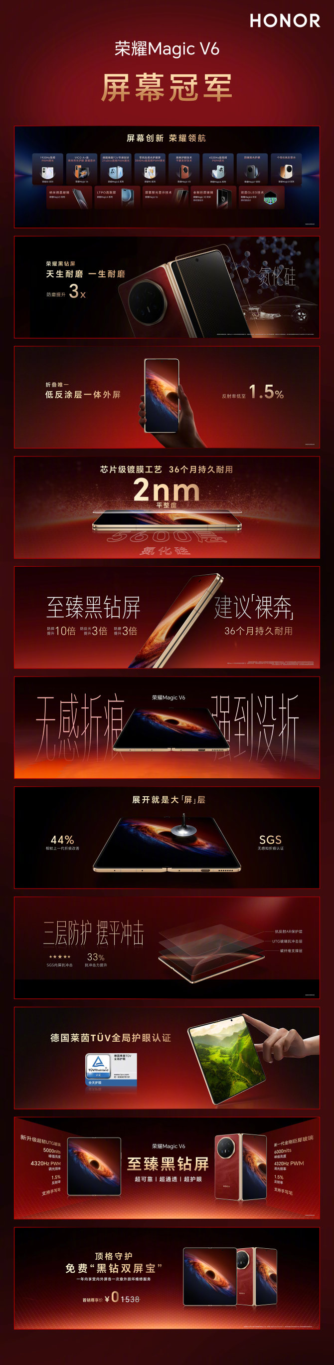 屏幕是这款新机的核心亮点之一,荣耀Magic V6 搭载全新至臻黑钻双屏,外屏采用新一代金刚巨犀玻璃,内屏则升级超韧 UTG 玻璃,内外屏分别支持 5000nits、6000nits 峰值亮度,均配备 4320Hz 高频 PWM 调光,反射率低至 1.5%,在强光下可视性出色,同时通过德国莱茵 TÜV 全局护眼认证。