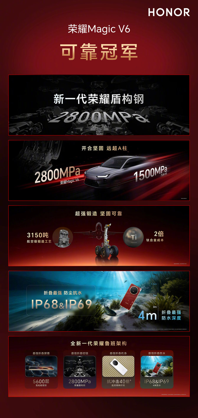 机身骨架采用新一代荣耀盾构钢,经由 3150 吨航空级锻造工艺打造,强度达到 2800MPa,远超汽车 A 柱,同时具备 IP68 与 IP69 双重防护,也是同级唯一支持 4 米防水的折叠屏手机。