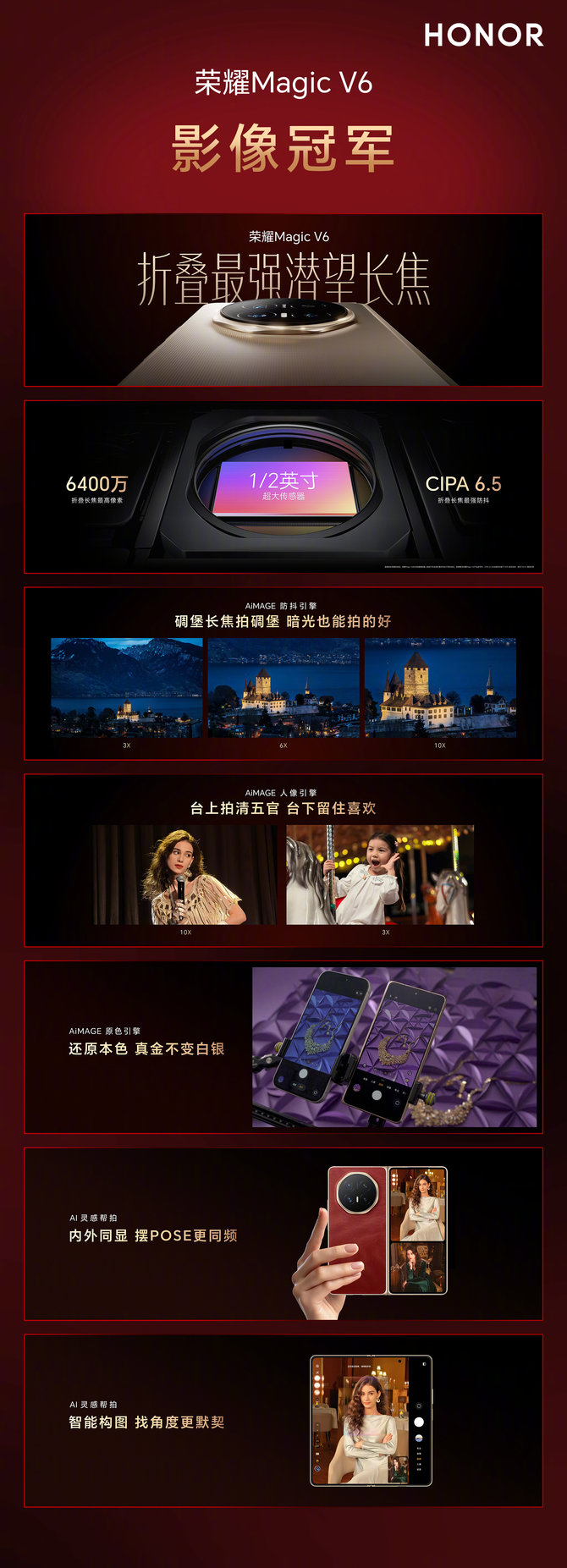 3 月 10 日,荣耀正式推出全新折叠旗舰手机荣耀Magic V6,这款定位高端的折叠屏机型以全方位的体验升级,再度刷新行业标准,新机提供赤兔红、旭日金、雪域白、绒黑色四种时尚配色,12GB+256GB 版本售价 8999 元起。