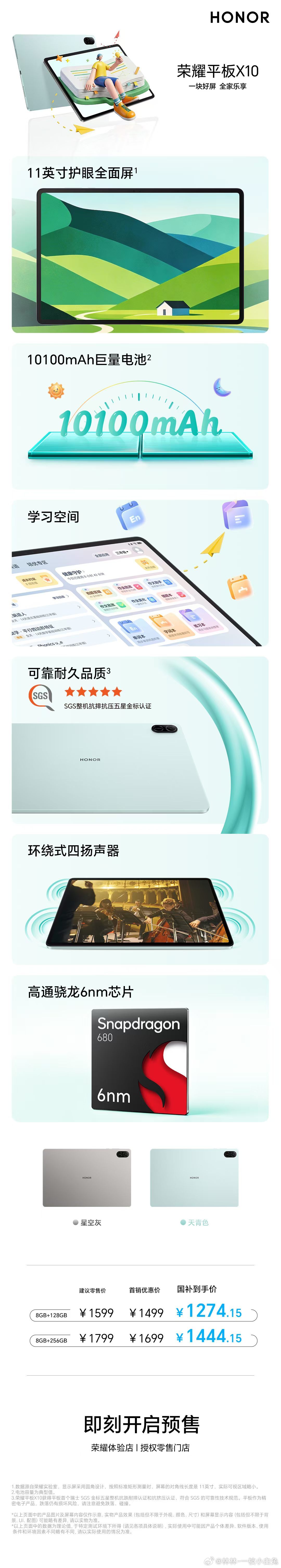 3 月 25 日消息,荣耀平板 X10 今日正式发布,该机搭载高通骁龙 680 处理器,首发价 1299 元起,配合国补政策后到手价低至 1104.15 元。