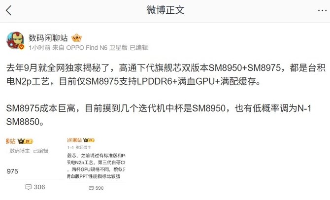 他提到,高通 SM 8975 成本巨高,目前摸到几个迭代机中杯是 SM 8950 ,也有低概率调为 N-1 SM 8850(第五代骁龙 8 至尊版)。目前尚不清楚这两款芯片的具体命名,结合高通此前的命名习惯, SM 8975 有望命名为骁龙 8 Elite Gen 6 Pro , SM 8950 或命名为骁龙 8 Elite Gen 6 ,以官方消息为准。