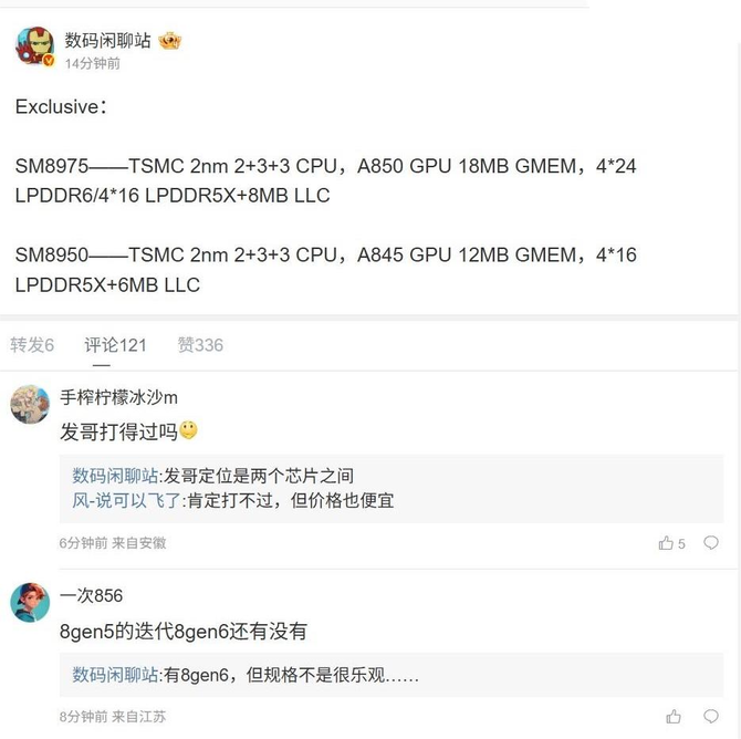 3 月 25 日消息,高通下一代骁龙 8 至尊版旗舰处理器的信息曝光,博主 @数码闲聊站 今日爆料了 SM 8950 和 SM 8975 两个版本的配置: SM 8975——TSMC 2 nm 2+3+3 CPU , A 850 GPU 18 MB GMEM , 424 LPDDR 6/416 LPDDR 5 X+8 MB LLCSM 8950——TSMC 2 nm 2+3+3 CPU , A 845 GPU 12 MB GMEM , 4*16 LPDDR 5 X+6 MB LLC 该博主还称 “发哥定位是两个芯片之间”,预计是指联发科最新的旗舰处理器天玑 9600 。博主还确认会有骁龙 8 Gen 6 ,但规格不是很乐观。注意到,该博主今年 2 月曾爆料称,高通下代旗舰芯双版本 SM 8950+SM 8975 ,都是台积电 N 2 p 工艺,目前仅 SM 8975 支持 LPDDR 6+ 满血 GPU+ 满配缓存。