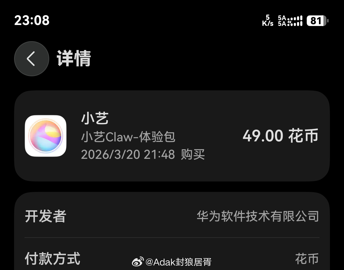 小艺 Claw 服务需付费开通。而据博主 @Adak 封狼居胥 透露,小艺 Claw 的服务价格为 199 元 6000 点数、49 元 1000 点数,支持使用花币付款。