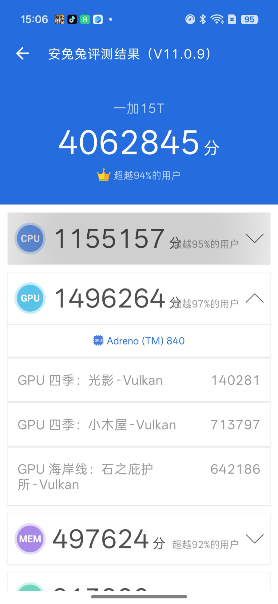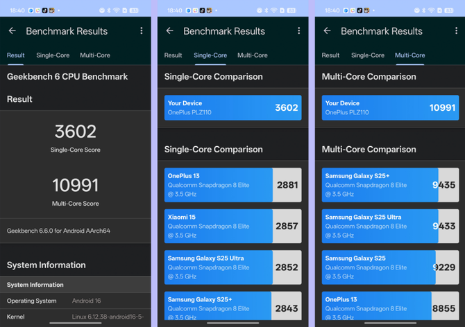 GeekBench的跑分方面,一加15T的单核心跑分为3602,多核心跑分为10991,这个成绩已经超过了目前绝大部分的旗舰机,性能表现优秀。