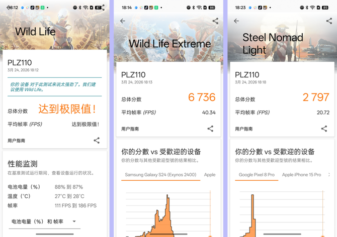 衡量手机图形性能的3DMARK测试项目中,可以看到不论是Wild Life Extreme还是Steel Nomad Light表现上,一加15T的性能表现都能够做到出类拔萃。