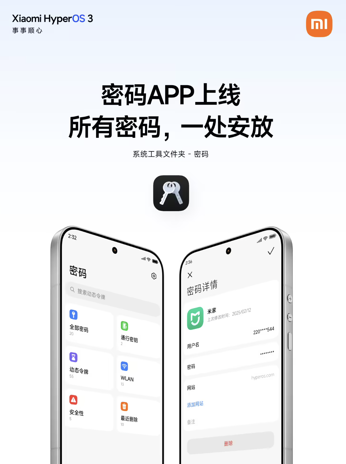 3月30日消息,小米澎湃 OS 官微宣布,小米澎湃 OS3 正式上线密码管理 App。该应用支持首次登录时自动抓取并存储密码,使用时可一键填充,已登录的 App 也可手动添加。