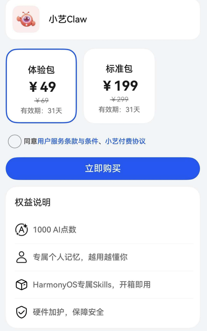 在计费模式上,小艺Claw采用AI点数付费机制:体验版标准定价69元,众测期间享有49元优惠价,有效期31天,附赠1000 AI点数;标准包售价299元,众测优惠价199元,有效期同为31天,提供更多点数额度。智能体支持多轮对话、任务拆解等能力,可在鸿蒙生态内实现跨App的自动化操作,例如通过对话指令完成购物、订票或信息检索等实际任务。