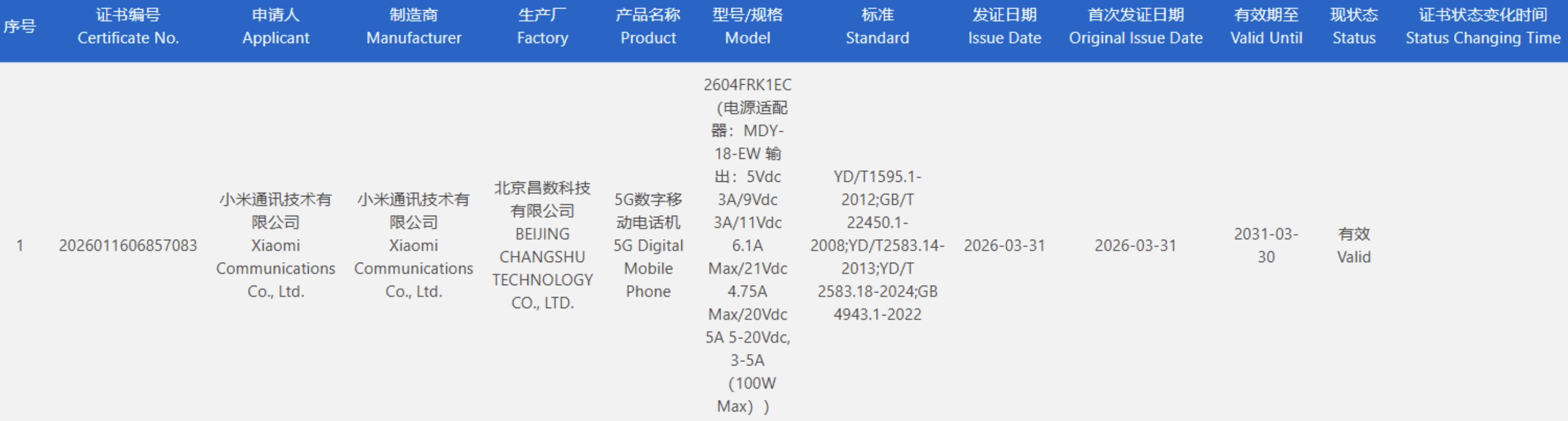 4月1日消息,今日,数码博主“数码闲聊站”透露,REDMI K90系列新成员入网,型号为2604FRK1EC,支持100W闪充。