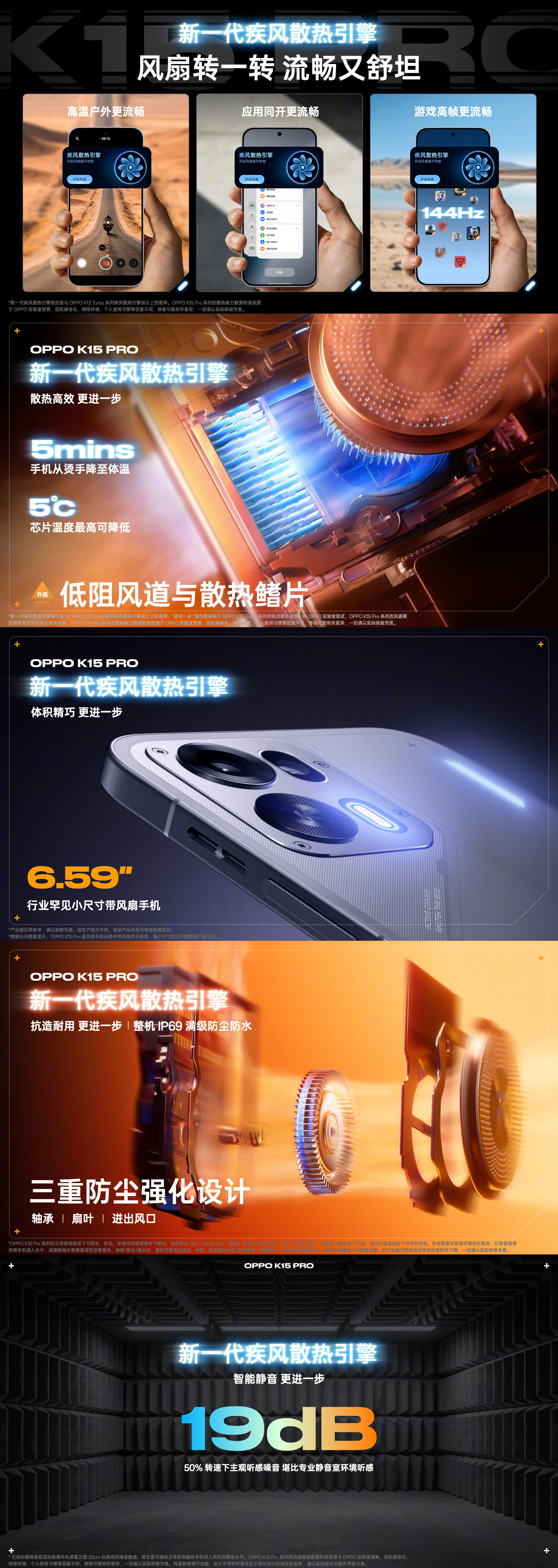 OPPO K15 Pro采用6.59英寸144Hz高刷屏,配备5000万像素光学防抖主摄,搭载全新ColorOS 16系统,支持手机通信共享、手表信息共享等跨生态功能。整机通过IP69防尘防水测试,配备新一代疾风散热引擎。Pro+版本升级至6.78英寸165Hz屏幕,搭载3D超声波指纹识别和灵犀按键,支持五大类热门手游原生165帧游玩。