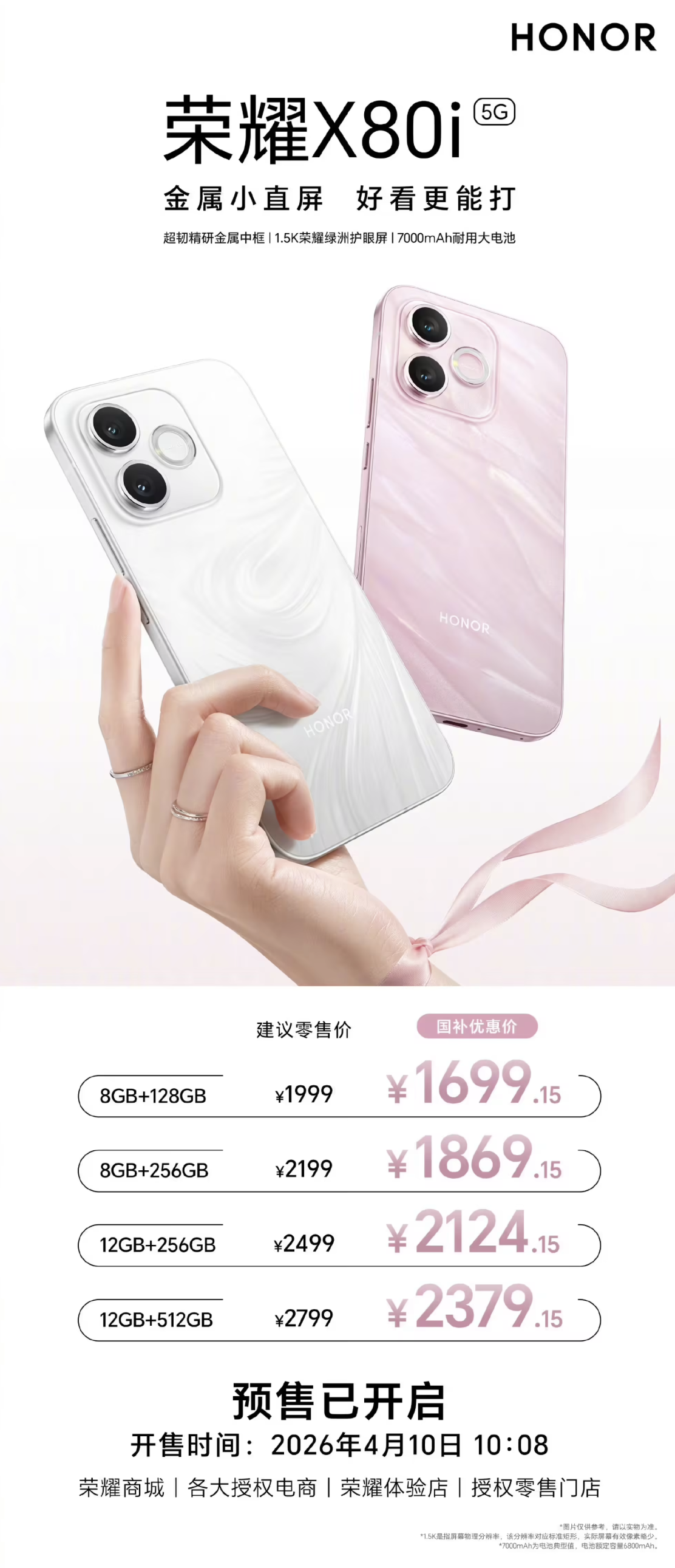 【IT168原创新闻】荣耀X80i今日开启全渠道预售,建议零售价1999元起,国补后到手价1699.15元起,4月10日正式开售。