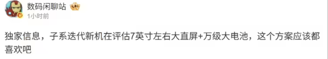 【IT168原创新闻】博主@数码闲聊站今日爆料,某厂子系迭代新机正在评估7英寸左右大直屏搭配万级(10000mAh以上)大电池的设计方案。结合该博主此前的爆料习惯以及网友分析,预计该机型为小米旗下红米(REDMI)新机。
