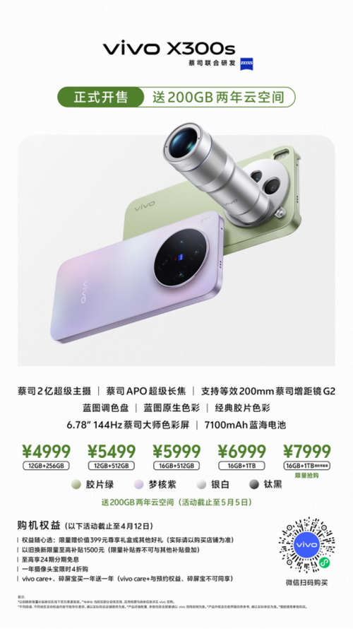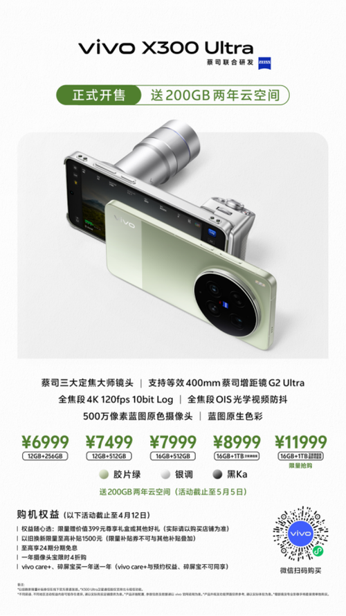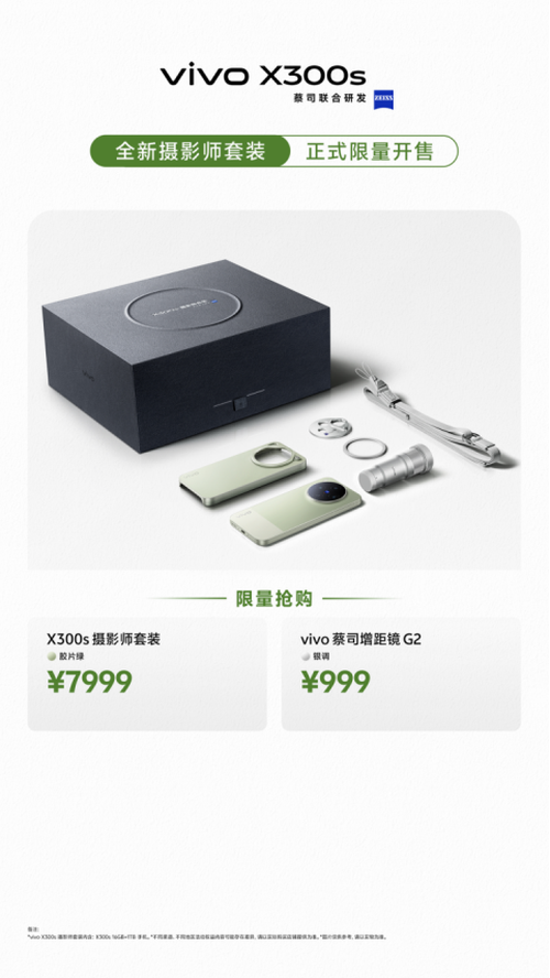 2026年4月3日,vivo X300 Ultra和vivo X300s全面开启销售,其中,vivo X300 Ultra起售价为6999元,拥有胶片绿、银调、黑Ka三款经典配色;vivo X300s起售价为4999元,拥有胶片绿、梦核紫、银白、钛黑四款活力配色。继3月30日发布后,“专业V单”X300 Ultra和“超能小V单”X300s凭借创新的产品思路和出色的产品力,引发广大用户的热烈反响,受到外界一致认可的同时,彰显出了两款产品非同凡响的竞争力,进一步延续了vivo X系列高端市场的良好用户口碑。